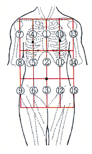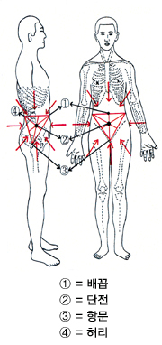 ③은 팔의 바깥쪽부분인데 이곳에 힘이 들게되면 그 힘의 반사는 교감신경을 자극하게되므로 자율신경 실조증이 되어서 모든 생리작용을 변조시키게 된다.