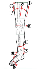 ⑥의 경우는 다리 아래쪽은 안쪽으로 향해져 있어야 한다. 이곳이 바깥쪽으로 향해지게 되면 다리관절에 무리가 걸리게 되고 팔자(八字)걸음의 원인이 된다.