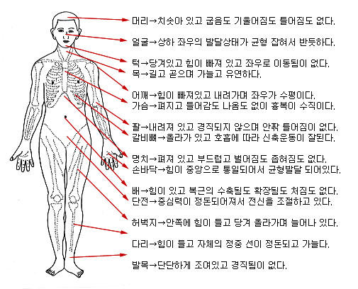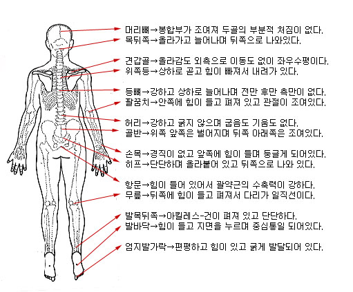 ▶수정법→요추2번 힘이 약해서 기울어진 자세는 몸이 좌우 측 중에서 기울어진 그 측의 동체에 힘을 넣어주는 수정을 하고, 요추3번 힘이 약해서 비틀어진 자세는 몸이 좌우 측 중에서 비틀어진 측과는 반대측으로 비틀어주는 수정을 하며, 요추4번 힘이 약해서 골반과 늑골의 신축력이 불량한 자세는 골반과 늑골이 협소하면 확장시켜주고 골반과 늑골이 확장되어있으면 수축시키는 수정을 한다.