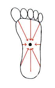 발의 전후 내외 및 대각선방향으로 힘이 균등하게 배분되어져서 그 힘이 족심(足心=발바닥의 중앙)에 집중되어져 있어야한다. 이 때 건강한 발이 되어지게 된다. 그런데 대부분의 경우를 보면 발의 힘이 치우쳐져 있으며 가장 흔한 경우가 족심에서 부터 발뒤꿈치 바깥쪽으로 편중되어있는 경우이다. 그래서 그곳에는 힘이 과하게 들어가 있게되고 그곳과 대칭 되는 엄지발가락 쪽에는 힘이 빠져있게 된다. 이런 자세가 되면 힘이 들어가 있는 곳에도, 힘이 빠져있는 곳에도 공히 이상을 일으키게 되어진다.