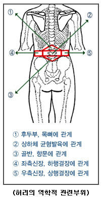허리는 어떤 동작을 행 하드라도 그 동작을 행하는 중심부가 되어있다. 따라서 모든 동작들을 허리힘으로 행할 수만 있다면 어떤 동작을 행 할 경우라도 그 동작이 바르게 되어지고, 빠르게 되어지며, 강하게 되어지게된다. 이렇게 되어지는 허리가 건강한 허리인데 이런 허리가 되려면 허리힘이 강하면서도 적절하게 안배되어져서 허리가 최소한 상하 좌우로 균형 발달되어져 있어야한다. 이때 허리 안쪽에 있는 요추(腰推=허리뼈)의 위치가 정돈되어지게되고, 신장이 힘을 받게되며, 상 하행결장에 부담을 주지 않게 되어진다.