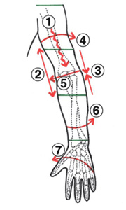 ⑥은 팔의 아래쪽 부분으로서 안쪽으로 비틀리기 쉬운데 바깥쪽으로 향해져야 한다. 이때 팔 관절의 비틀림이 없어지게 되고 명치의 협소함도 바르게 된다.