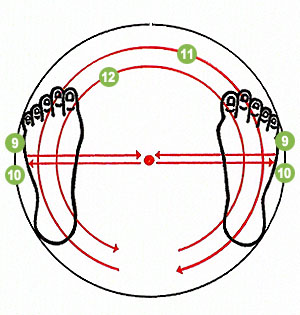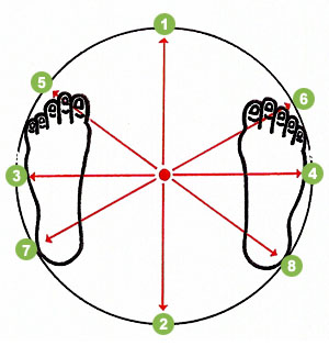 요가를 수련하는 것은 이 단전력 강화에 목적이 있는데 이것이 잘되어지려면 먼저 양발의 힘이 양발 사이의 중심점이 되는 곳으로 통일되어지도록 해야한다. 그러나 대부분 사람들은 이 양발의 힘이 중심부로 통일되어있지 못하고 어느 한쪽으로 편중되어있다. 그 예로서 아래의 그림은 양발의 힘이 중심부에서부터 12가지방향으로 편중되어 있음을 표시한 것이다.