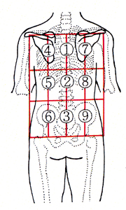 ⑨의 경우는 오른쪽 골반과 다리는 발달상태가 불량하고 그 측 폐는 무리가 걸린다. 왼쪽의 발목 무릎 골반은 경직되고 내장은 힘이 약하게 된다.