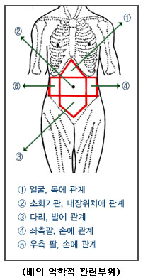 ②의 부분에 들어있어야 될 힘은 ①의 부분에 있는 힘보다는 강해야하고 ③의 부분에 있는 힘보다는 약해야하는데 대부분의 경우 이 곳의 힘이 약하게 되어있다. 이렇게 되면 그 안쪽에 들어있는 소화기계가 약해지면서 그 위치가 이동되어지게 된다. 즉 이 부분에 있는 배꼽이 안쪽으로 들어가 있느냐, 바깥쪽으로 나와있느냐 또는 왼쪽으로 이동되어져 있느냐, 오른쪽으로 이동되어져 있느냐 에 따라서 내장의 위치가 그 측으로 이동되어지게 되고 내장의 위치가 이동되어지게되면 소화기관은 그 본래의 강력한 힘을 잃게 되어진다.